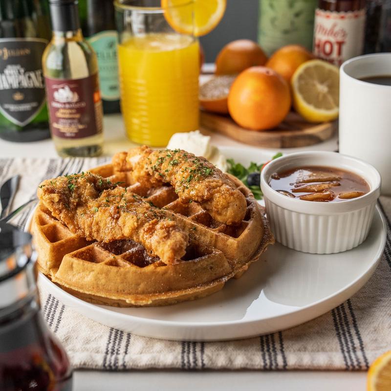 Fried chicken tender meat served on top of a golden brown waffle topped with hot honey, powdered sugar, and dried parsley.