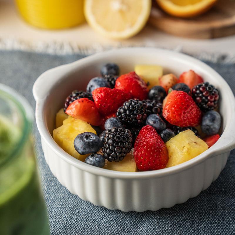 Greek yogurt with strawberries, blueberries, and blackberries topped with almonds, granola, and local honey.